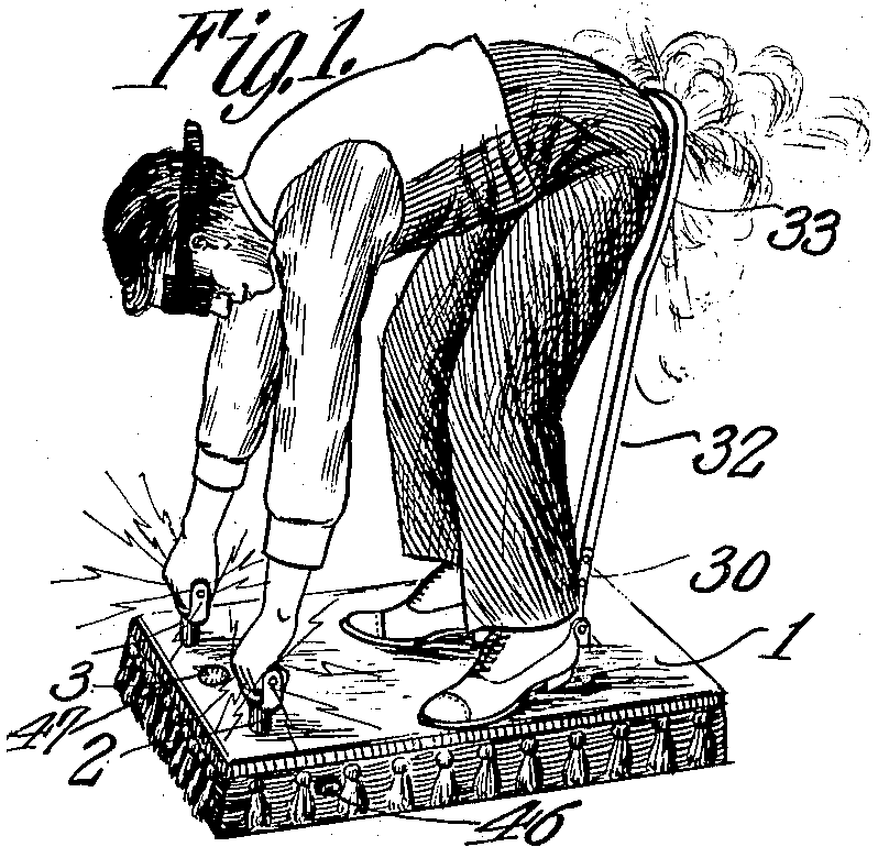 The ‘874 patent was courteous enough to spell out the state of the art in self-spanking, citing a 1909 patent, the “combined lifting and spanking machine”: https://patents.google.com/patent/US920837A