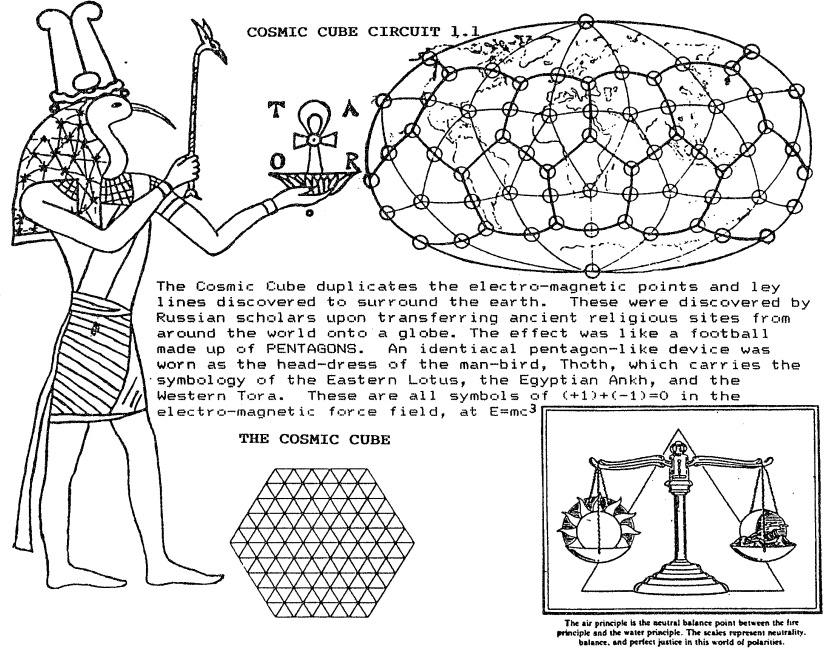 Below you’ll find the full document. Sometime I should come up with a Crackpot Bingo card to help evaluate these. It touches on modern physics, Christian scripture and eschatology, Egyptology, and makes a mess of all of them. It even name checks Buckminster Fuller, and I could do a whole series of posts on him alone. The only thing it doesn’t mention is how the Cosmic Cube has been a part of Marvel Comics lore since 1966… Cite your sources, Winifred!