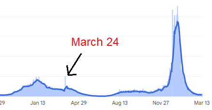 Happy St. Patrick’s Day, for those of you who observe it. I am restraining my enthusiasm this year, because I remember the huge spike in COVID cases that appeared a week after last year’s St. Patrick’s Day: