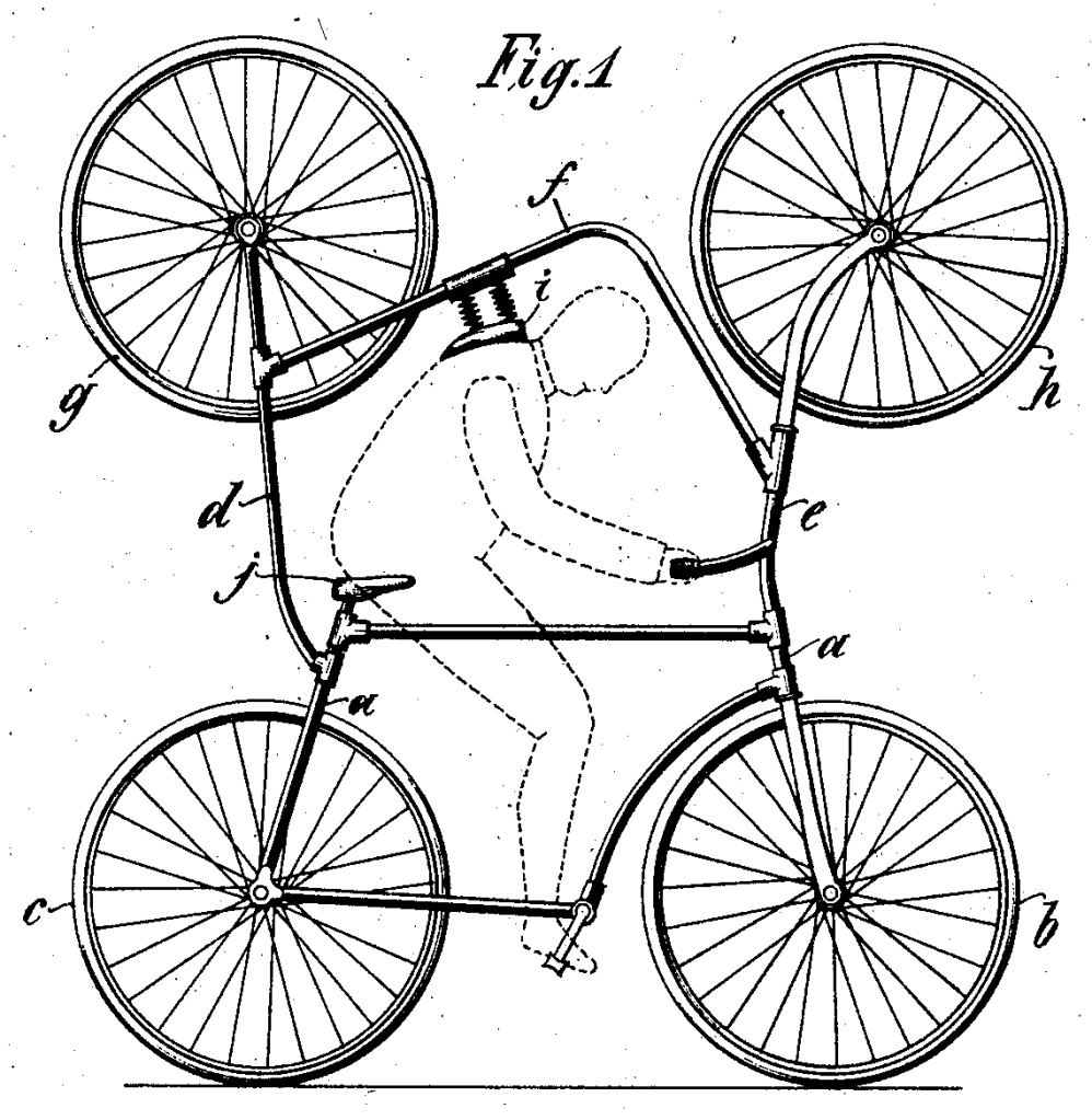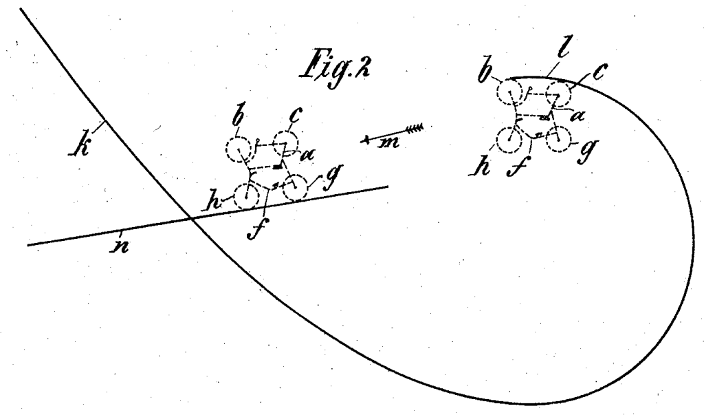 The first thing I want you to know about this patent is that it was filed by a German citizen in 1904, “a subject of the German Emperor,” so I want you to read this whole post in an extravagant German accent. So for example, “Ze object iss to profide a cycle by means of which a MUTILATED LOOP may be traversed, the performer SPRINGING, mit dem veel, off ze end uff ze loop vile Kopf downward und running off onto a track leading out uff ze loop on ze zwei upper veels uff ze cycle Kopf unter Fuss.”