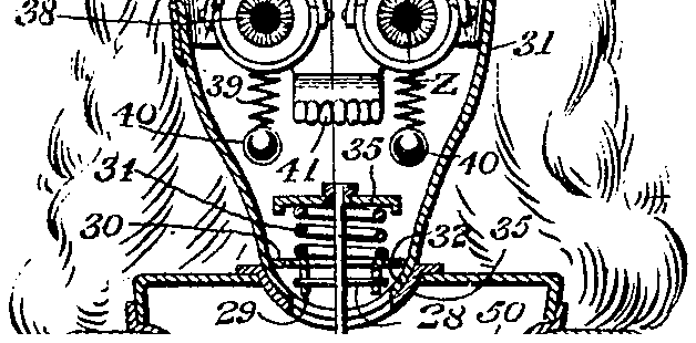 41 designates the doll’s teeth, which are carried by a bar 42, suitably supported on the frame 43, which also carries the eyes, eyelids, and their adjuncts.
