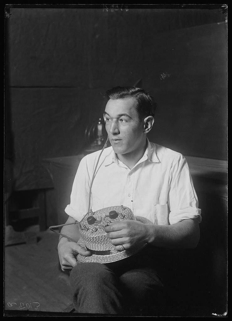 This radio hat was reported in the August 1930 issue Modern Mechanix as being invented by a German. But before even that, this photo from the early 1920s shows a man with his radio hat: